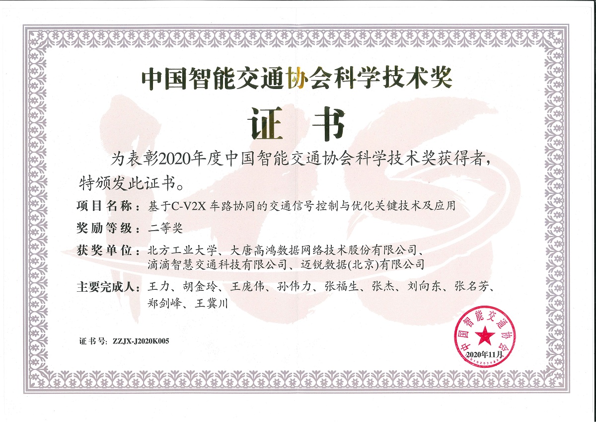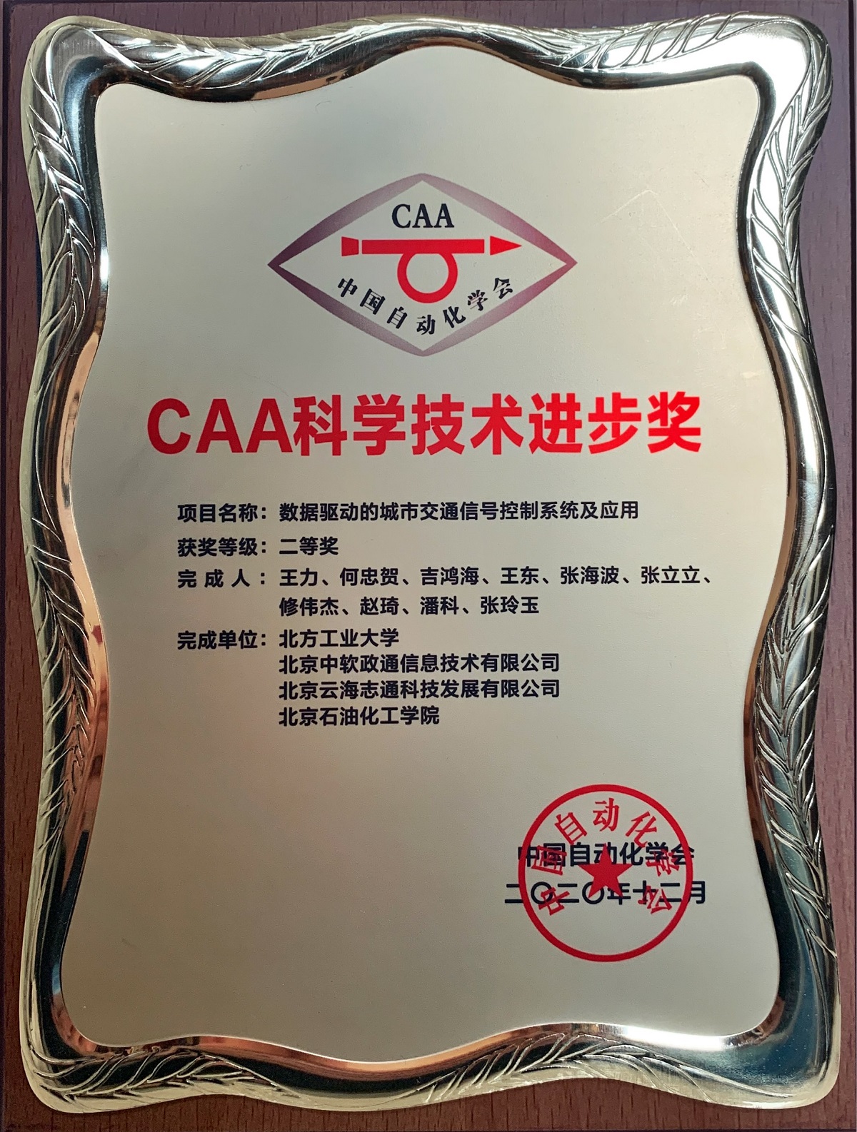 此次大会上,公司作为第一完成单位、王力教授、何忠贺副教授等牵头申报的“数据驱动的城市交通信号控制系统及应用”成果荣获2020年度中国自动化学会科学技术进步二等奖。该项目面向智能驾驶对交通控制系统与装备的新需求,提出了基于CPS架构的交通控制系统设计与优化理论方法与技术并在北京、潍坊等地应用,社会经济效益显著。