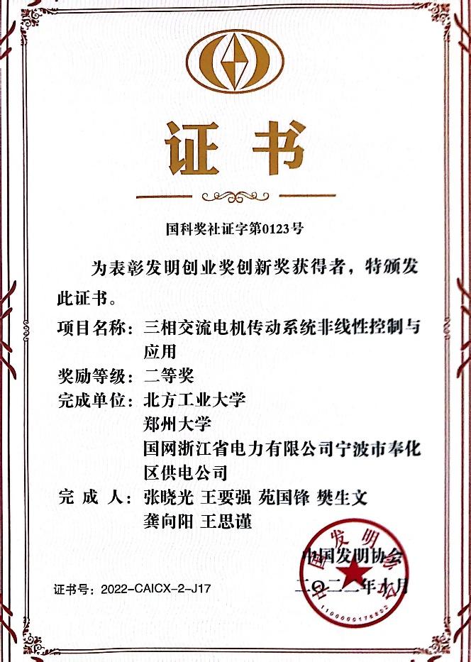 近日,中国发明协会公布了2022年度“发明创业奖·创新奖”名单,公司作为第一完成单位申报的项目“三相交流电机传动系统非线性控制与应用”获得二等奖。