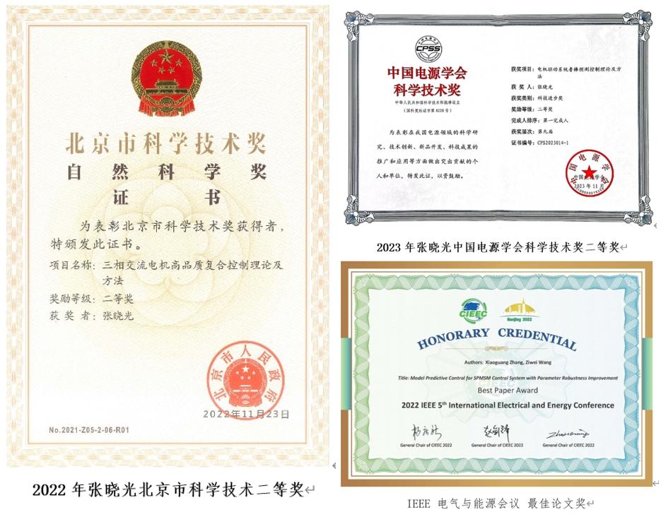 张晓光教授近年来针对交流电机变频系统研究了新型模型预测控制等理论并在实际项目和产品得到应用,在交流电机模型预测控制领域具有国际影响力,围绕本领域发表SCI/EI学术论文100余篇,其中ESI高被引论文6篇,授权国家发明专利/软件著作权30余项。以成果第一完成人获北京市自然科学奖二等奖、中国电源学会科技进步二等奖,国家级教学成果二等奖、北京市教学成果一等奖、国际SCI期刊最佳论文奖、IEEE国际会议最佳论文奖等奖励10余项。