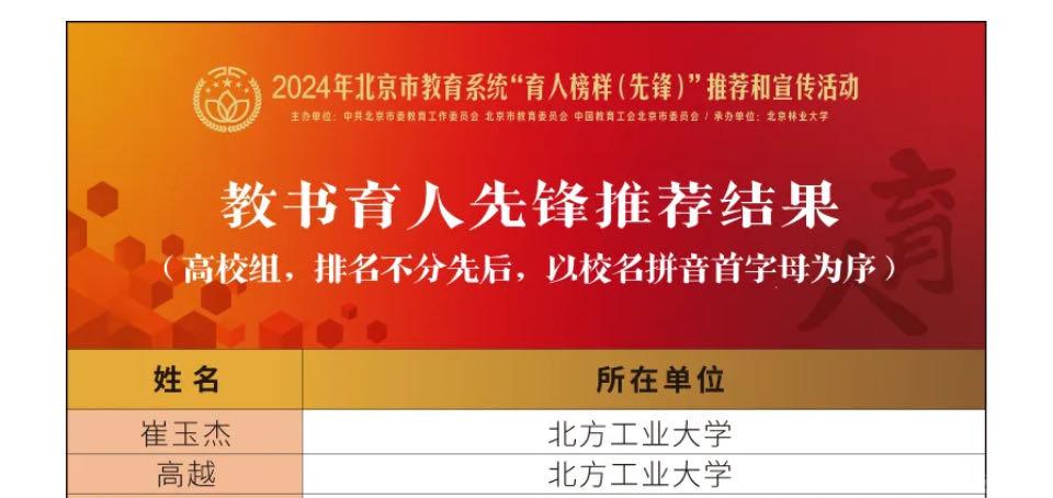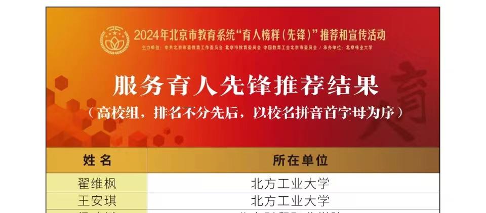 近日,北京市教育系统“育人榜样(先锋)”推荐结果揭晓,公司理公司崔玉杰、文法公司高越老师获评“教书育人先锋”,信息公司李伟、党委宣传部左芳舟老师获评“管理育人先锋”,yl88858永利集团翟维枫、教务处王安琪老师获评“服务育人先锋”。